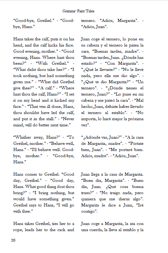 As a Spanish teacher I highly recommend this book format! It allows to contrast the two languages easily.